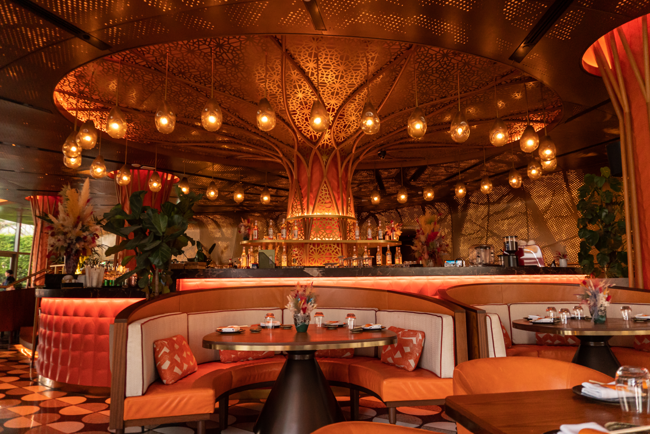 Located on the glistening Persian Gulf coastline inside the new Waldorf Astoria Lusail in Qatar’s Entertainment City, SUSHISAMBA Doha features the brand’s signature restaurant and the very first Beach Club. Transporting the guest to a dream-like escape, the venue is a spectacle of light with an incredible day-to-night transformation. The tree-like, three-dimensional perforated walls and ceiling petals immerse guests throughout the space with theatrical patterns, while the custom Brazilian-inspired terrazzo flooring anchors the space.